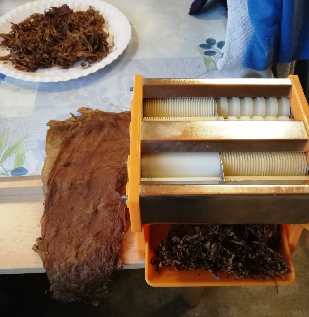 Zmeljemo jih v mlinčku za rezance ali z ostrim nožem narežemo na poljubno širino. Tako obdelani tobačni listi naj nato v tesno zaprtih kozarcih počivajo vsaj 1 mesec, šele nato so pripravljeni za uporabo.