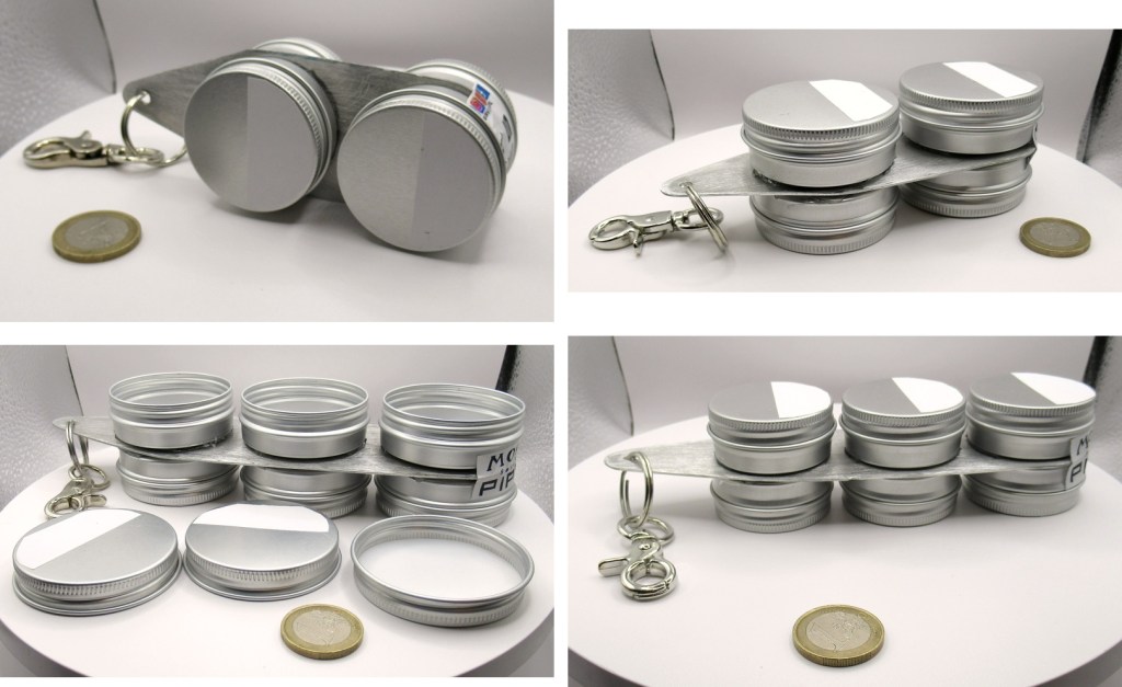 I got to work and used aluminum tins along with an aluminum spacer plate, making the whole setup light, durable, and resistant. The tins are glued and additionally riveted together so they can’t come loose, even with everyday use. Finally, I added a carabiner so the set can be easily clipped onto a belt, bag, or backpack.